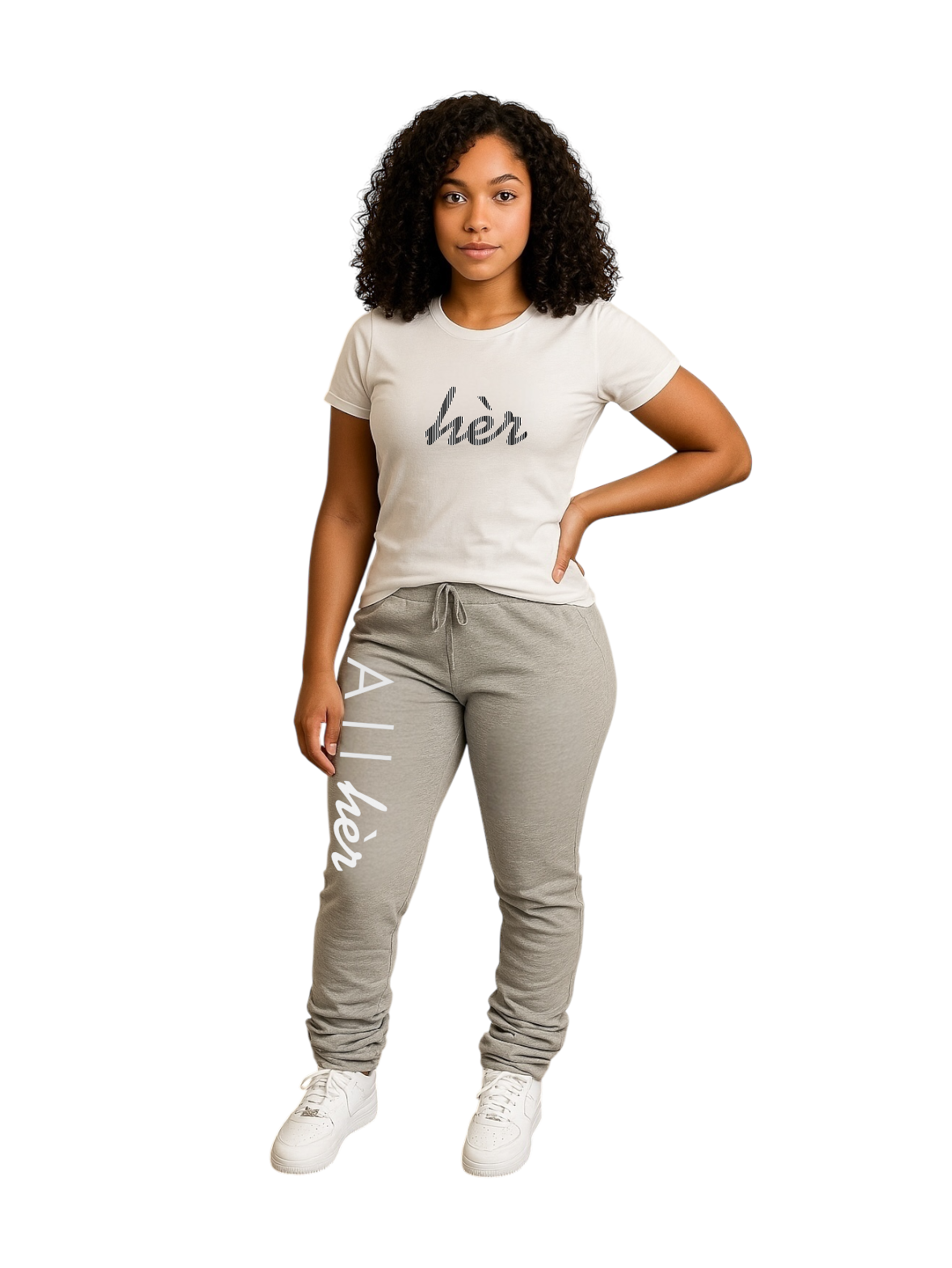 Stacked on hèr is your go-to for effortless edge. Featuring a fitted tee and stacked joggers that hug just right, this look is all about soft confidence and subtle pressure. Whether you’re chillin’ or checking bags, the vibe stays the same: unbothered, undeniable, and all hèr.
